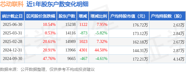 从股价来看,2025年3月31日至2025年6月30日,芯动联科区间涨幅为10.54%,在此期间股东户数增加1122.0户,增幅为7.95%。